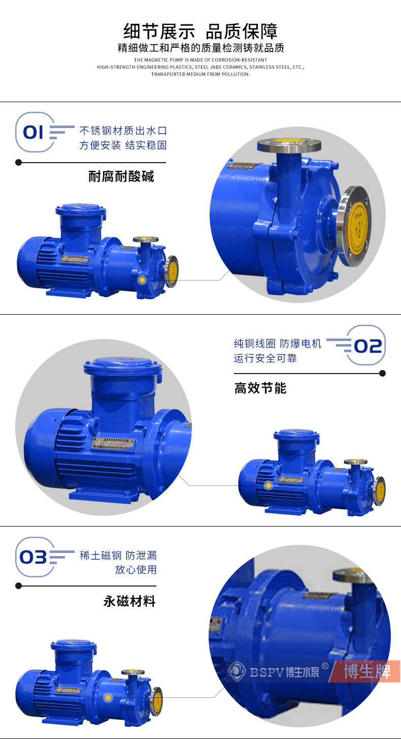 上海博生水泵制造有限公司生產的不銹鋼磁力泵 20CQ-12P耐堿不銹鋼 防腐蝕磁力泵 上海磁力泵廠家CQ型磁力驅動泵(簡稱磁力泵),CQG型耐高溫磁力驅動泵(耐溫≤250℃)(簡稱磁力泵)是將永磁聯軸器的工作原理應用于離心泵的新產品,主要材料有不銹鋼、增強聚丙稀,工程塑料。設計合理,具有全密封、無泄漏、耐腐蝕的特點。